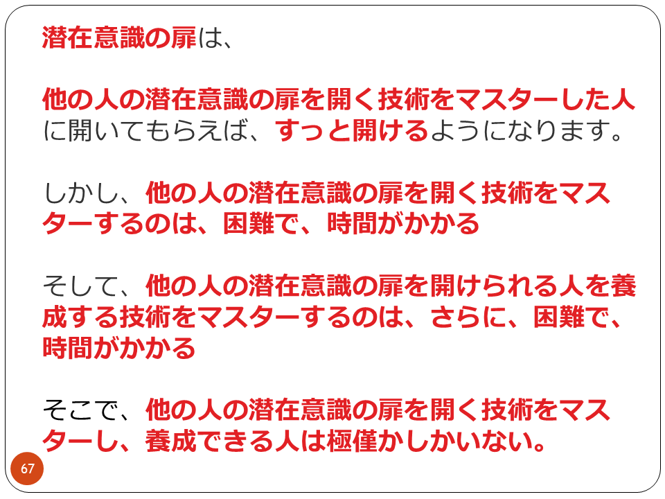 通常の意識状態ではない「変性意識状態」になると、表面意識と潜在意識を隔てる「潜在意識の扉」を開け、性格のデータを探り、望む方向に変化させることが出来る。”